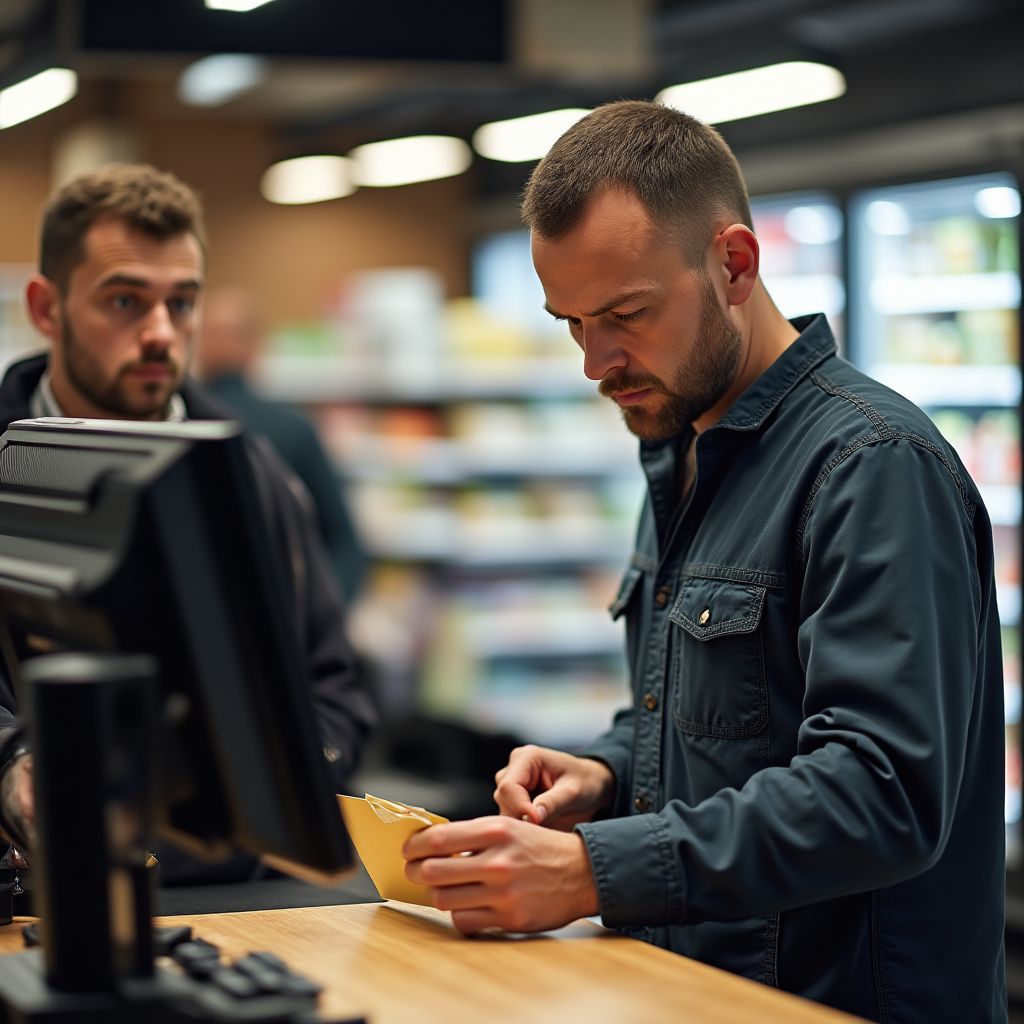 На кассе стоял мужчина средних лет с усталым лицом и обветренной кожей. Его худощавое тело было укутано в потёртый пуховик, который, казалось, ещё помнил более тёплые времена. Глаза — тёмные и усталые — наблюдали за бегущими по полкам продуктами, а иссушенные руки нервно теребили края бумаги. Его низкий рост и неуклюжая осанка говорили о долгих годах борьбы за выживание. На ногах — потрёпанные ботинки, давно не видевшие хорошего ремонта, а на лице — сдерживаемая тревога и усталость. Периодически он оглядывался, будто опасаясь кого-то или чего-то. Было ясно, что он чужой среди этих чистых, улыбающихся людей с их полными корзинами и беззаботными разговорами.