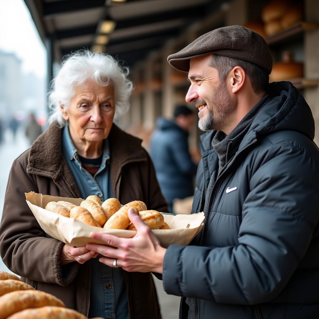 Мысли старушки путались в тревоге: «Сегодня я должна купить хлеб… Но хватит ли денег? — вздохнула она. — Как же трудно жить на пенсию, когда цены всё растут. Нет, надо держаться, Вера, ещё один день — и будет легче.» Сердце билось учащённо, на глаза набежали слёзы, но старушка стиснула зубы и выдохнула холодный зимний воздух. Её взгляд остановился на добром продавце — мужчине средних лет с уставшей улыбкой и тёплыми глазами.