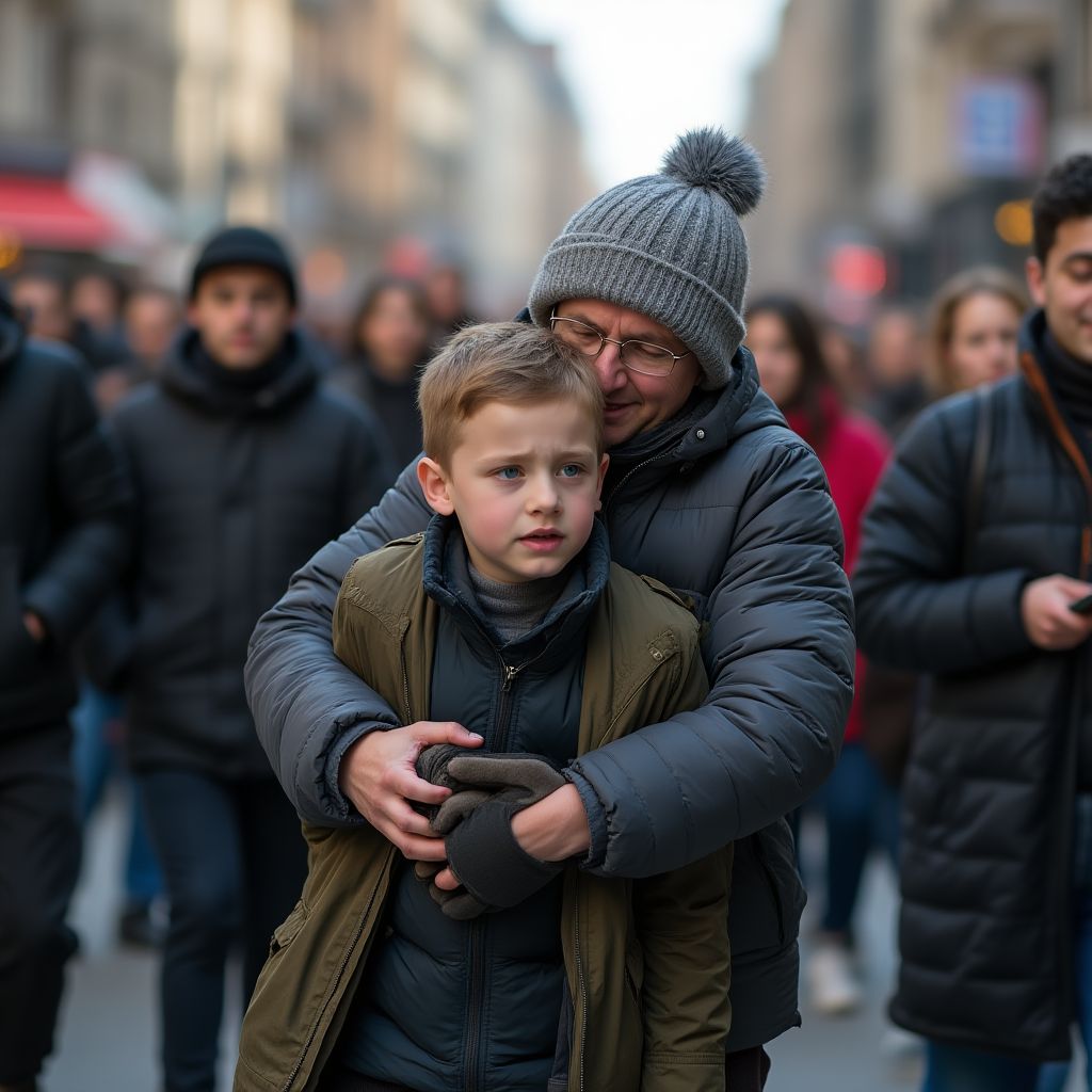 Стояла поздняя осень. Вокзал города погрузился в сумеречный полумрак, и влажный, холодный воздух смешивался с пряным запахом горячего чая из ближайшего кафе. Толпа спешащих, громкие объявления, эхом отражавшиеся от высоких стен, и клубящийся пар от уличных ларьков создавали ощущение хаоса и суеты. Между потоком людей мелькали уставшие лица, покупатели, торопливо держащие детей за руки, и одиноко стоящие бездомные, пытавшиеся согреться под облезлыми пальто. Шуршащее эхо гудков поездов и скрип шагов на плитке казались аккордами этого бесконечного городского спектакля.nnВ этой буре неразберихи выделялся маленький четырёхлетний мальчик с грязными каштановыми волосами и большими испуганными глазами. Он был одет в слишком большой для него потёртый пальто, на котором виднелись следы заплат. Он стоял у края платформы и не мог понять, куда делась его мама. Его маленькое сердце билось так быстро, что казалось, оно готово выскочить наружу.nnПрохожий — мужчина средних лет в поношенном плаще, с усталым взглядом и неопрятной бородой — заметил растерянного ребёнка. Его глаза, привыкшие видеть только трудности жизни, смягчились. Мужчина подошёл и, присев на корточки, спросил тихо: «Ты потерялся? Где твоя мама?»nn«Мама ушла, я не знаю, где она», — прошептал мальчик, голос дрожал.nnВокруг — гудели поезда, звучали крики пассажиров, но в этот момент казалось, что весь мир замер. Мужчина почувствовал на себе все тяготы жизни, прожитой в нищете, и понял — он должен помочь этому малышу.nn— «Слушай, не бойся. Я помогу тебе найти маму», — тихо сказал он.nnНо люди проходили мимо безразлично: «Опять кто-то с ребёнком, сейчас полиции настряпают», — слышалось в уголках. Другие косились, выкрикивали насмешки: «Эй, бездомный, не трогай детей!» Мальчик ощутил эту волну чужого презрения, сжавшись в комочек. Его губы дрожали, а глаза наполнились слезами.nn— «Не слушай их», — говорил мужчина, скованно улыбаясь, — «Ты не один.»nnСовсем рядом, за углом, женщина в модной одежде лишь равнодушно взглянула, одернула свою дорогую сумку и ушла дальше, не обратив внимания на ситуацию. Горечь несправедливости сдавила мужчину в груди, он почувствовал тяжесть чужого равнодушия на себе. «Почему никто не поможет? Почему дети в этом городе одни?» — думал он с отчаянием и злостью.nn«Нужно что-то делать, нельзя оставить его здесь одного», — решительно сказал он себе, вглядываясь в растерянное лицо мальчика.nnНеспешно мужчина взял мальчика за руку, и они двинулись к кассам, чтобы обратиться за помощью. Но вдруг в толпе кто-то резко окликнул их. Мужчина обернулся, и время будто замедлилось. Его сердце екнуло — лицо этого человека было ужасающе знакомым. О чём он не догадался, но что-то в воздухе вокруг сгущалось — напряжение росло.nn«Что случится дальше — невозможно забыть!»