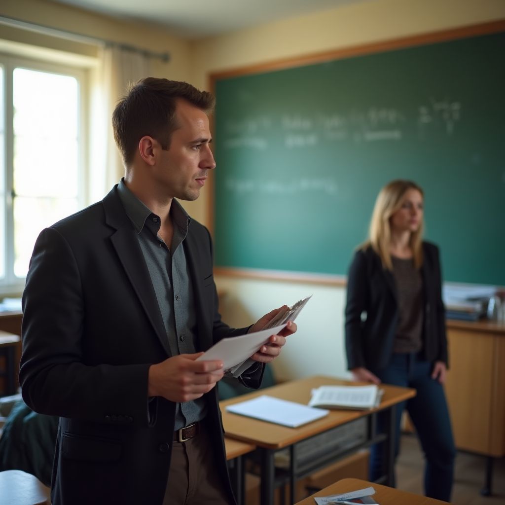 В центре комнаты стоял учитель средней руки лет сорока с усталым взглядом голубых глаз, аккуратно одетый в скромный серый костюм, который чуть не по размеру. Его локоны, едва поседевшие на висках, хаотично растрёпались после раннего подъёма. Он держался сдержанно, с прямой осанкой, но в его движениях ощущалась лёгкая скованность, будто от внутреннего конфликта. За его спиной виднелась старая доска с чёткими надписями, а ученик, которого он нещадно только что выгнал, стоял в дверном проёме, сохраняя спокойствие, но с едва заметным отблеском упрямства в глазах. В его потертых джинсах и поношенной куртке угадывалась история борьбы с жизненными трудностями.