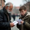 Внутренне мальчик был взволнован и растерян. «Что он хочет мне дать? Просто так? Почему именно я?» — думал он, сжимая кулак в кармане куртки. Утренние разговоры мамы о помощи нуждающимся эхом отдавались в его сознании. Он переступил шаг, немного замер, понимая, что сейчас решится, пойти или уйти. Сердце билось громко, как барабаны вдалеке, а холод в пальцах усиливал ощущение неизвестности.