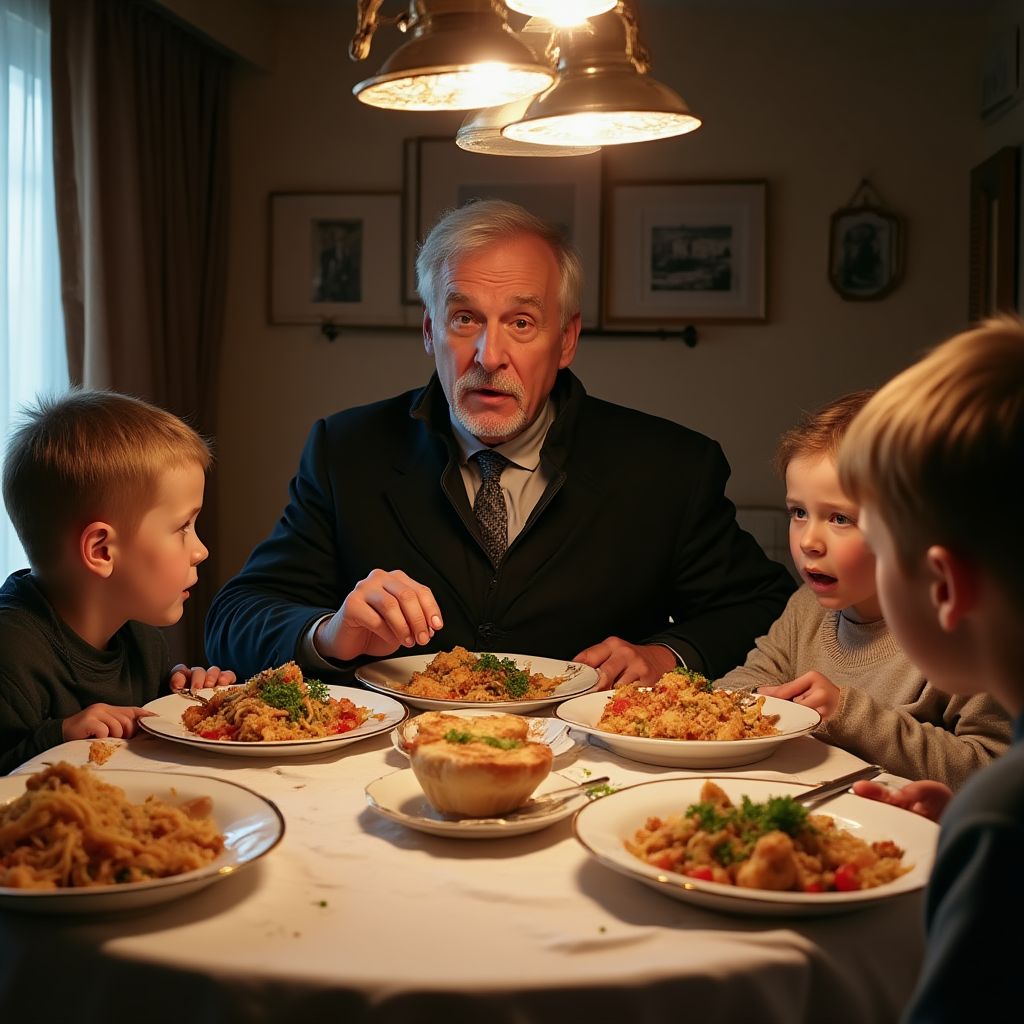 За столом сидел отец — старик с морщинистым лицом, затянутым строгой скукой и усталостью многих лет. Его пронзительные серые глаза были полны немого сожаления, а плечи, согнутые от тяжести прошлого, казались ещё более горбыми в тусклом свете. Он аккуратно сложил руки на стол, не сразу решаясь заговорить. На нём была простая потёртая рубашка и старая вязаная жилетка, которые подчёркивали скромность и строгость его натуры. Вся семья — дети разного возраста и их спутники — замерла, чувствуя, что эта ночь станет переломной.