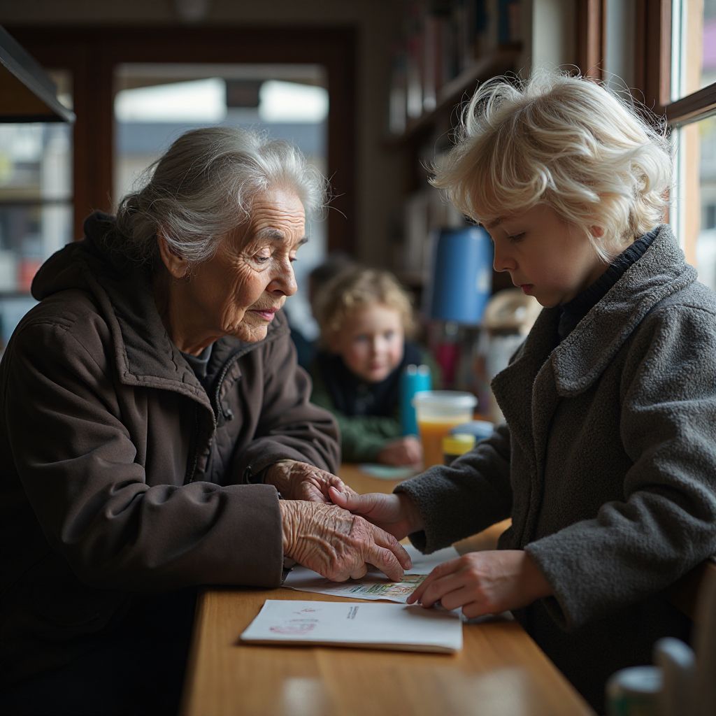 В её голове вращались мысли о внуках, которых давно не видела, и о том, как мир изменился слишком быстро для неё. Сердце её еле бьётся от забот и усталости, а мысли — о том, что в жизни ещё можно сделать доброе дело, особенно когда кажется, что время уходит безвозвратно. Она выбрала этот магазин неслучайно — часто здесь встречала матерей с детьми, нуждающихся в помощи. Сегодня, войдя с тяжестью в душе, её цель была проста, но важна.