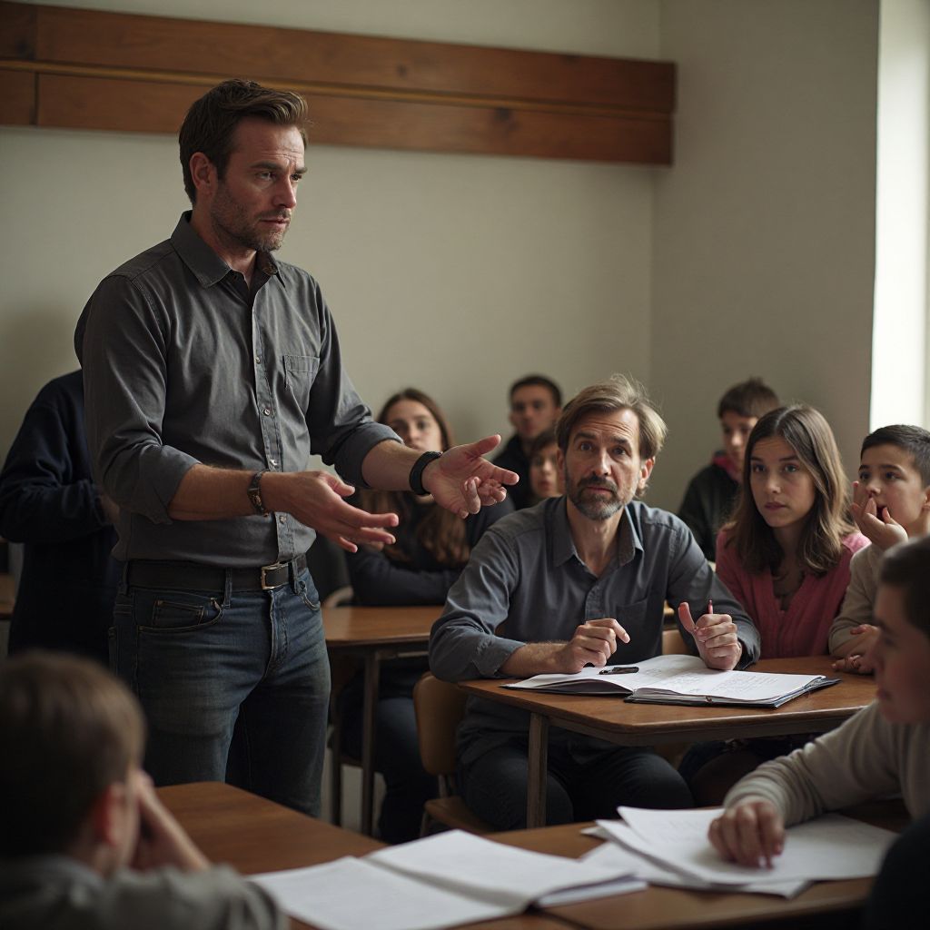 В душе его билась буря — постоянное беспокойство о будущем сына и чувство социальной несправедливости, которое он ощущал на себе последние годы. Ещё несколько месяцев назад он был обычным рабочим на заводе, отчаянно пытающимся свести концы с концами. Сейчас же обстоятельства привели его сюда — на школьное собрание, где каждая минута может изменить многое. Мысли мелькали в его голове, как лавина: «Почему именно наши дети должны страдать из-за чужих ошибок? Почему система так жестока?»