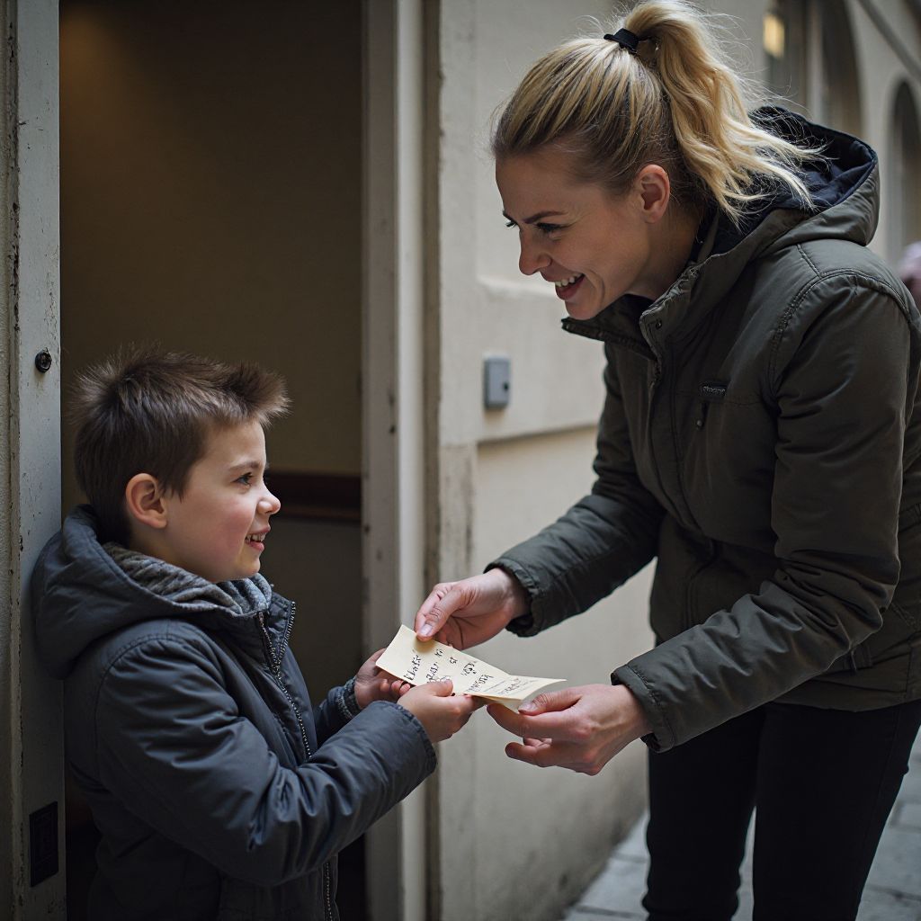 Сердце Елены билось так громко, что казалось — его слышат все вокруг, когда она медленно подняла взгляд на мальчика, протянувшего ей таинственную бумажку. Его глаза светились тревогой, а лёгкий дождь, упавший на его волосы, делал облик ещё более хрупким. Вокруг шёпоты вздыхающих прохожих, и казалось, что весь мир замер в ожидании ответа.