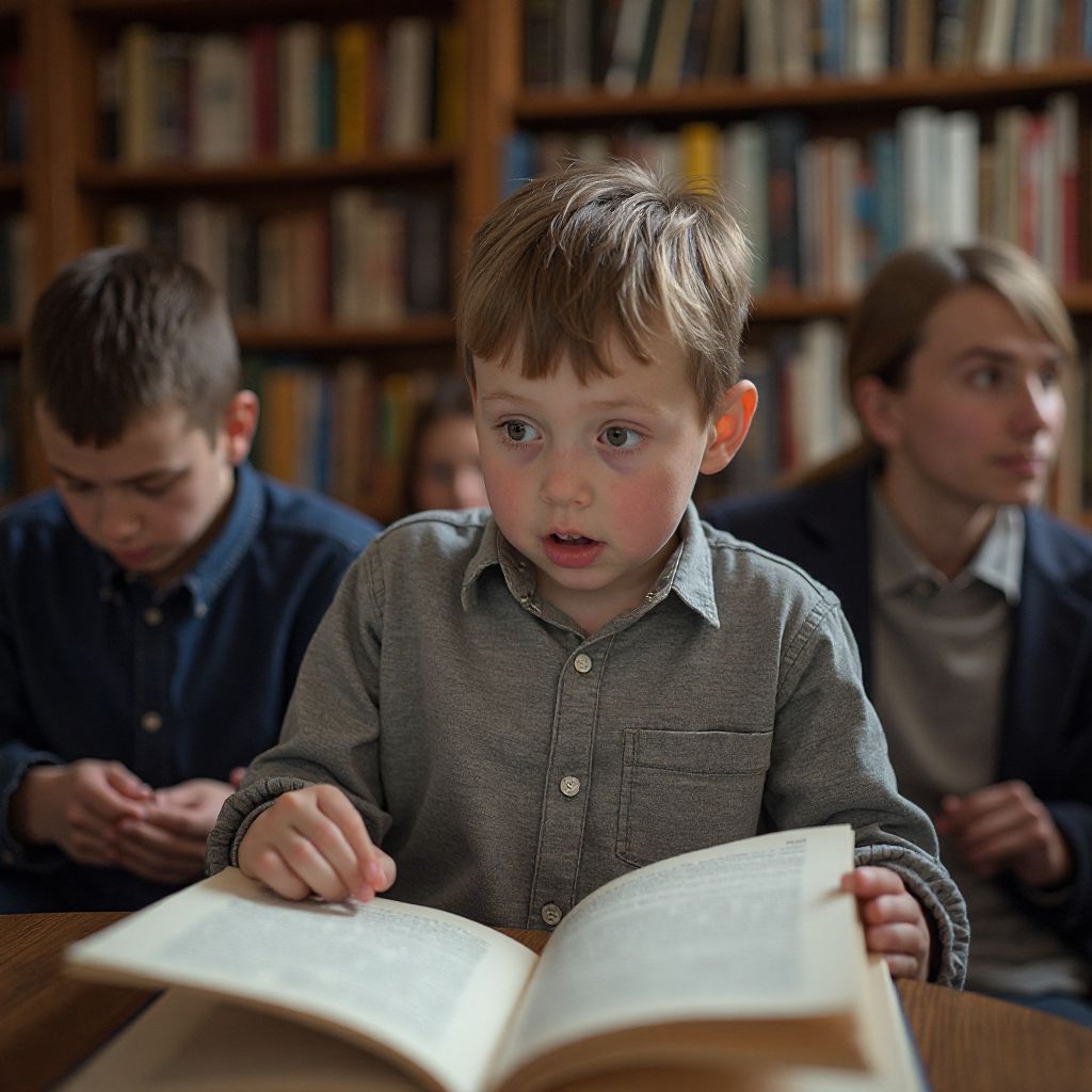 На скамейке у старого деревянного стола сидел мальчик двенадцати лет, худощавый, с грязными коленками и взъерошенными тёмными волосами. Его глаза — большие, карие и наполненные тревогой — внимательно следили за каждым посетителем. На нём была простая, но поношенная куртка, а в руках он осторожно держал толстую книгу с потрёпанной обложкой. Его плечи слегка сутулились, разговаривал он редко, почти шепотом, словно боясь привлечь внимание. Казалось, что он принадлежит к другому миру, где скромность и страх уродуют детство.