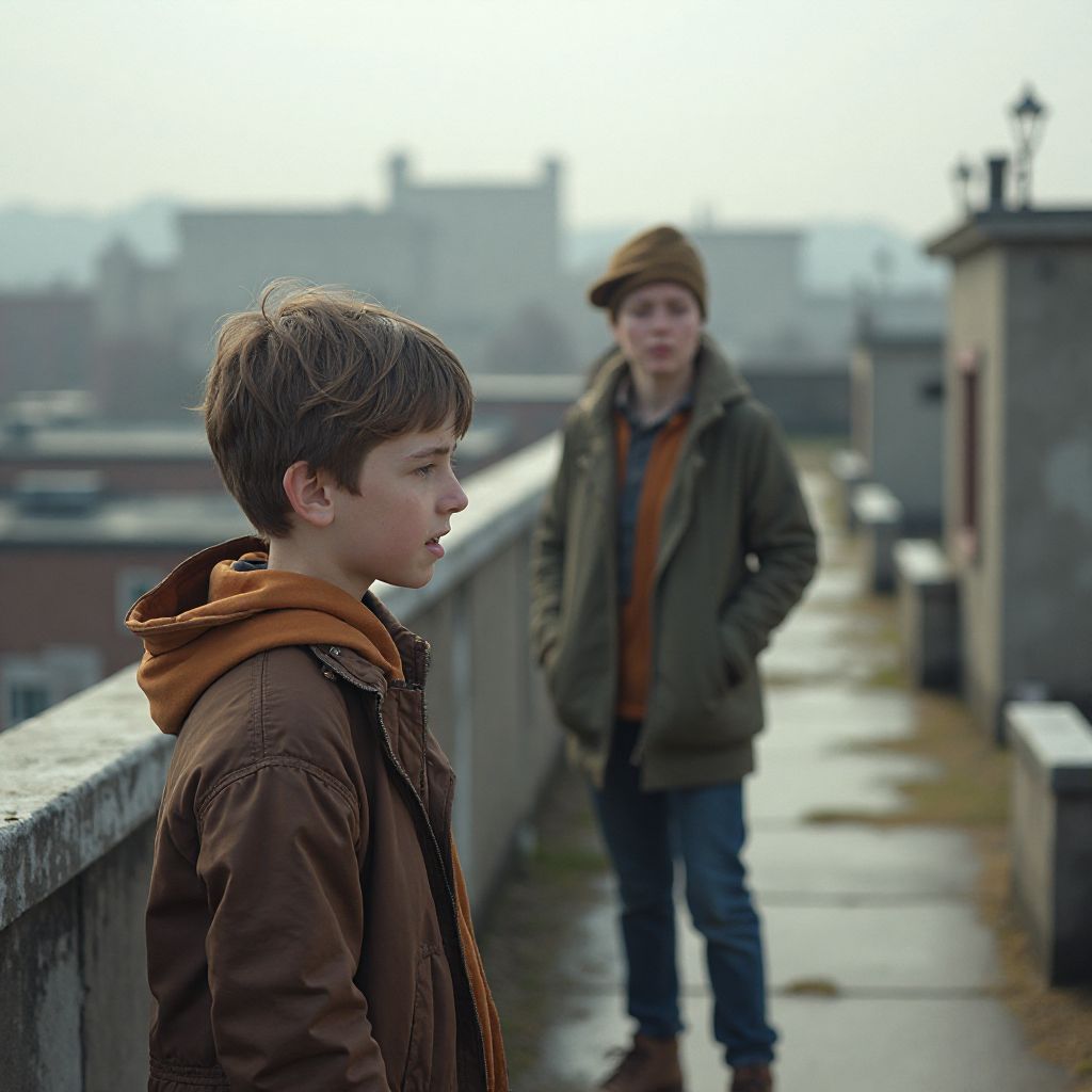 Мальчик отошёл к краю крыши, крепко сжимая письма в руках, сердце билось учащённо — словно оно вот-вот вырвется наружу. Он понимал, что нужно сделать выбор, хотя мысль о помощи казалась далёкой мечтой. «Я не могу здесь сидеть вечно, кто-то должен знать правду», — думал он, глядя вниз на бесконечный поток людей и машин. Его ноги подогнули, готовясь к решающему шагу.