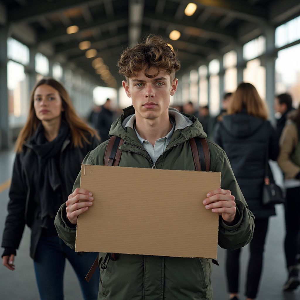 Он стоял, хрупкий и призрачный, словно посреди бескрайнего моря людской равнодушия. Взгляд его был неподвижен, голубые глаза — холодны и полны усталости, а дрожащие руки сжимали табличку с выцветшими буквами. Едва заметный рост и неопрятная серая куртка, пропитанная пылью города, отличали его от шумной толпы, спешащей по своим делам. Его волосы небрежно падали на лоб, а ботинки — поношены до дыр, как и его надежды. Казалось, здесь, в центре суеты, он — лишний, чужой и забытый.
