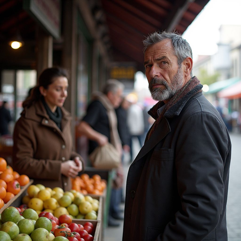 Раннее утро на старом рынке окутала прохладная дымка. Холодный июльский ветер скользил между прилавками, заставляя лёгкие занавески дрожать, смешивая запахи свежих овощей с тлением угольного костра слева. Первые лучи солнца заблестели на мокром асфальте, вода капала с листьев капусты, изредка прерываясь стуком деревянных ящиков. Голоса торговцев и покупательский гул создавали мелодию этого места, смешиваясь с редкими криками чаек, далеко пролетавших над рынок. Время казалось застывшим — момент, полный неясных ожиданий и тонкой тревоги.
