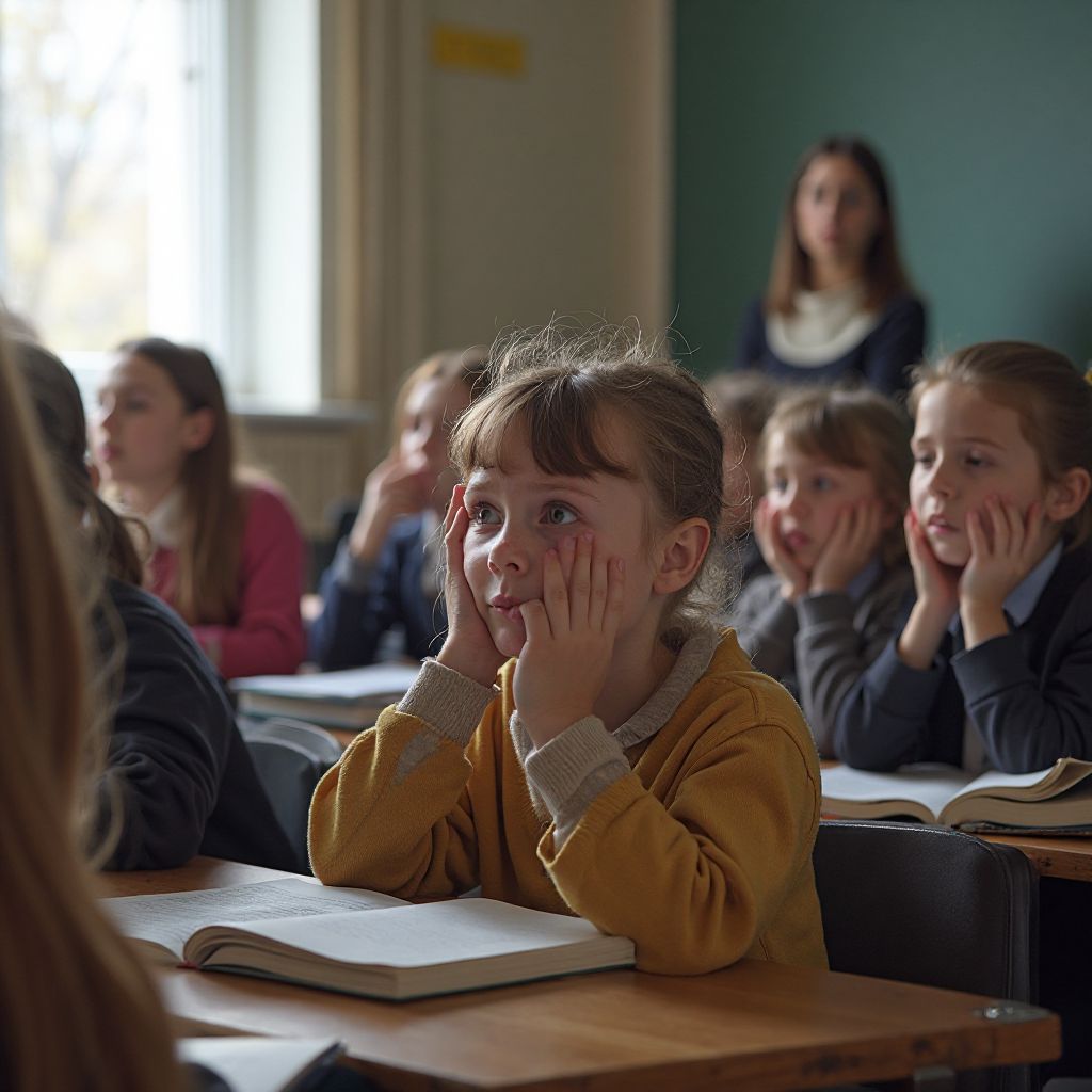 — «Почему учительница опоздала? Нам уже нельзя начинать?» — шепнула девочка из последнего ряда, ее голос дрожал, словно листок в осеннем ветру.