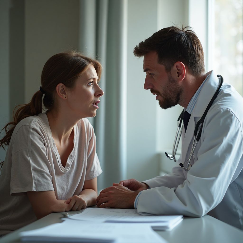 В голове женщины кружились мысли: «Почему он не может помочь? Почему тогда врач говорила, что помощь придёт? Что же дальше?». Сердце стучало быстрее от тревоги, а напряжение делало каждое прикосновение пальцев холоднее. Она медленно поднялась, решаясь снова попросить помощи, хотя понимала — её голос может остаться без ответа.