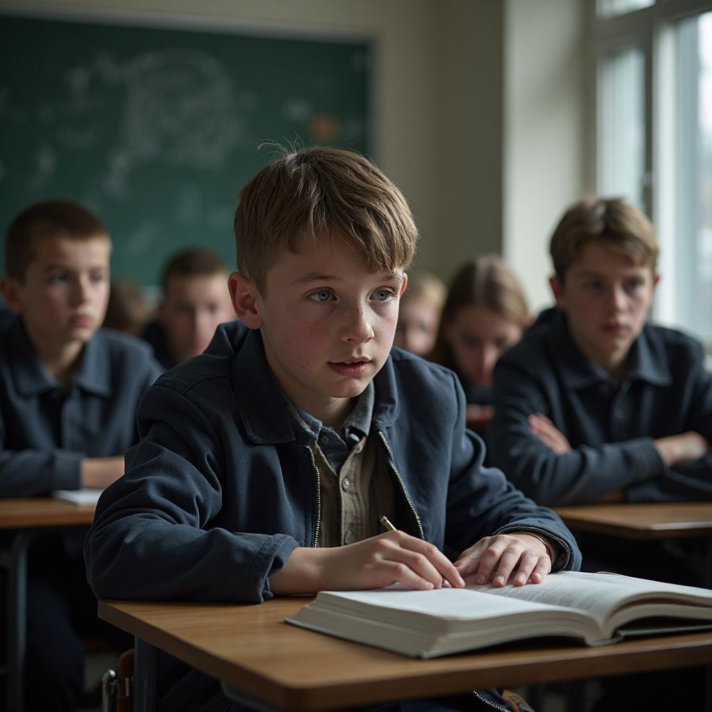 Перед классом стоял Сергей – ученик с усталым взглядом и мешками под глазами, которые казались глубже обычного после бессонной ночи. Его невысокий рост и небрежно растрёпанные волосы выдавали юность и нервозность. На нем была старая куртка, с потертыми локтями и расстегнутой молнией, скрывающая поношенную футболку. Обувь — на грани износа, и тонкие шнурки развязывались снова и снова. Его осанка была слегка сгорбленной, будто он не просто опоздал на урок, но и нес груз невидимого всем напряжения. Задыхаясь и стараясь не привлекать лишнего внимания, он вплетал свой путь к своей парте в углу комнаты.