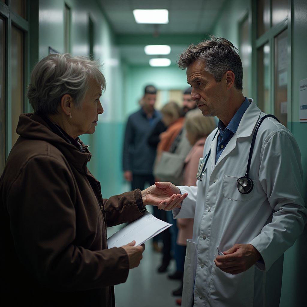 В этот момент в коридоре раздался привычный шелест — подошёл доктор. Он молодой, в белом халате, с осторожным и немного усталым взглядом. Его немного раздражала медлительность старушки, которая протянула ему конверт со словами, понятными лишь ей. «Что это? — спросил он, взглянув на поскрипывающий конверт. — Вы уверены, что это не ошибка?» Старушка мягко ответила, но её слова были на захлёбывающем диалекте, который никто из стоявших вокруг не мог понять. «Она вообще здесь что делает? — пробурчал мужчина в тёмной куртке. — Зачем отвлекать доктора?»