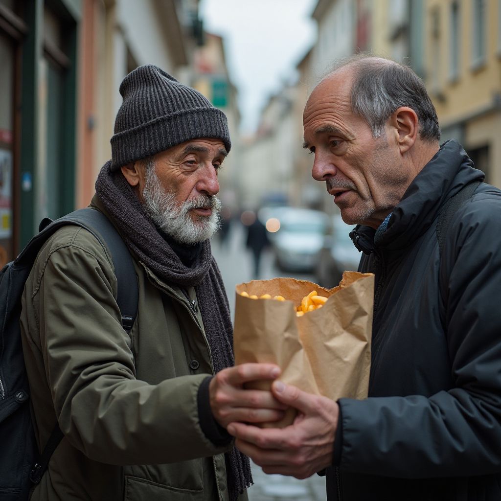 Сергей в последний раз взглянул на лицо мужчины, который подарил ему сумку с едой и открыл двери в новую жизнь. «Спасибо,» — произнёс он тихо. Их истории переплелись навсегда, напоминая о том, что за каждым бездомным стоит человек с прошлым и будущим, и что человечность — главное, что нас объединяет.