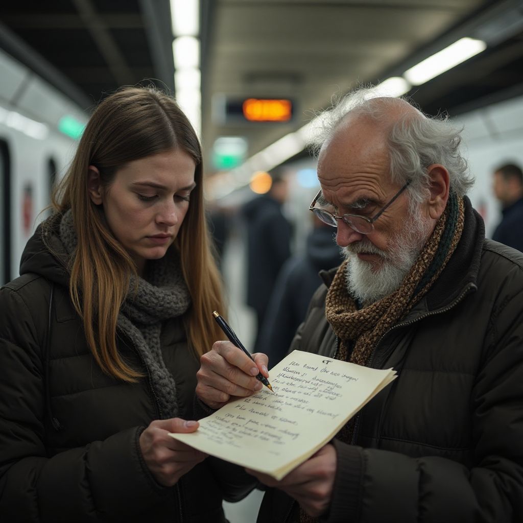 В это время к скамейке подошла девушка лет двадцати с глухим взглядом усталости, одетая скромно, в поношенный плащ, её руки дрожали от холода и нервозности. Она остановилась, увидев старика, и невольно заглянула на бумажку, на которой появились несколько разборчивых слов. В её глазах сразу заблестели слёзы. Ее сердце забилось быстрее — это были слова, которых она так давно ждала, и которые могли навсегда изменить её жизнь.