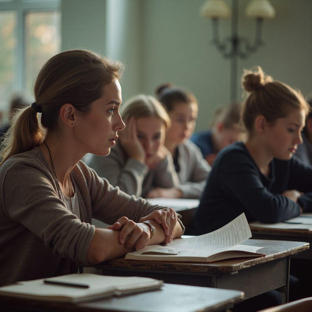 На одной из последних парт сидела Марина Ильина, учительница с мягкими глазами цвета темного ореха и аккуратно заплетёнными в узел седыми волосами. Её тонкая фигура была укутана в потертый кардиган, который не скрывал усталости, но излучал теплоту. Несмотря на годы в профессии, её усталое, но гордое лицо не теряло выражения глубокой заботы о детях. Она выглядела чужой среди бегущих мимо учеников – её скромная одежда и тихая речь явно отличались от городской суеты и шумного потока подростков. В её взгляде мелькала тяжелая печаль, словно неслышная борьба с невидимыми демонами, которая уже давно не отпускала её.