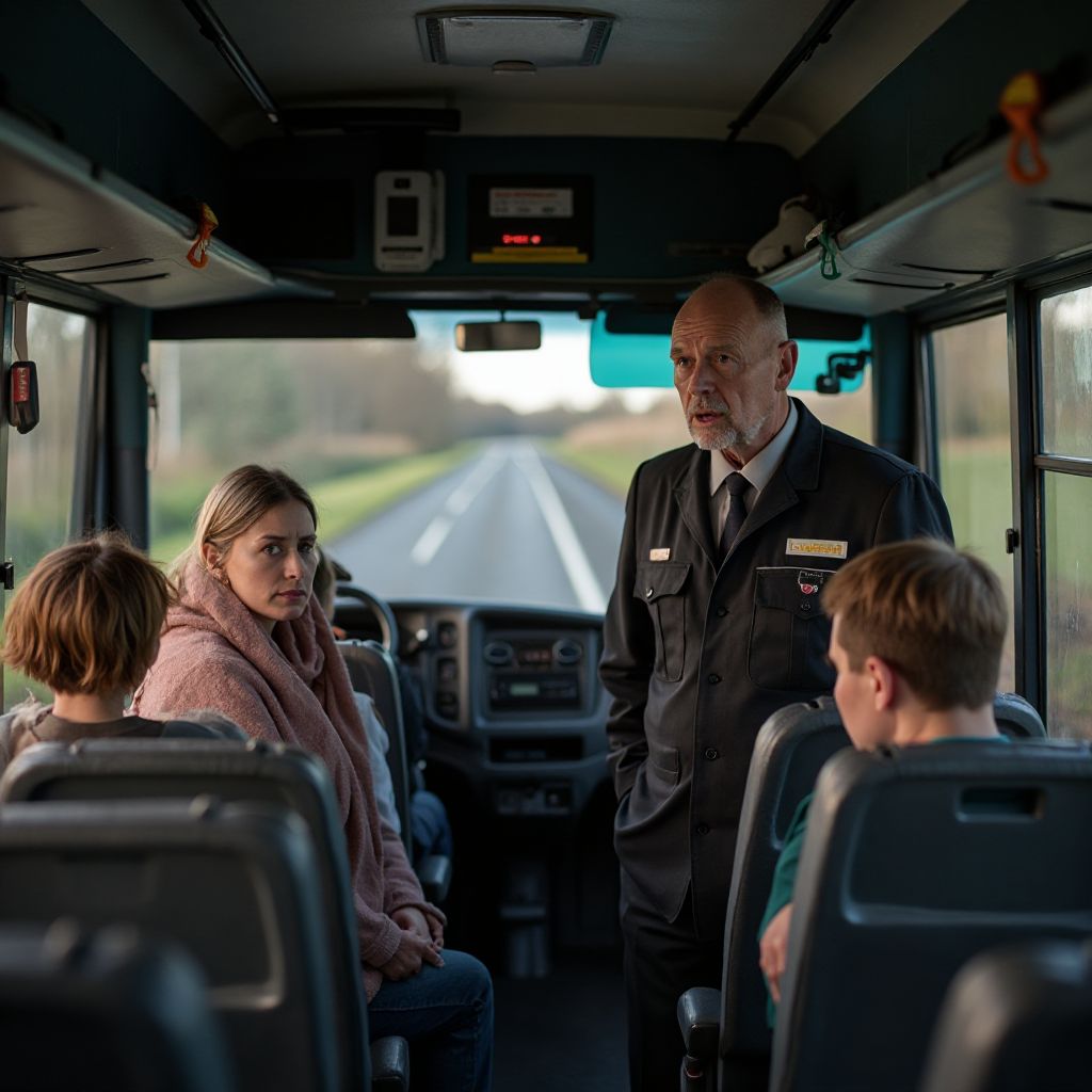 В воздухе сомкнулась невидимая сеть напряжения: пассажиры переглядывались, шёпоты становились громче, и даже дети замерли, ощущая тревогу взрослых. В задней части автобуса кто-то тихо вздохнул, кто-то замолк в нерешительности. Внезапно водитель оглянулся, его глаза блеснули настороженностью, и на мгновение лицо исказилось, словно воспоминания давали о себе знать.