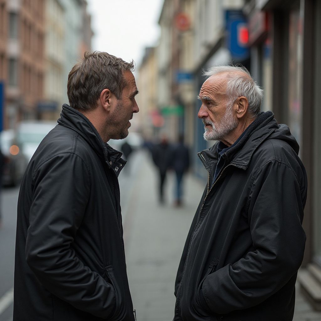 Навстречу ему шел мужчина в деловом костюме — строгий, подтянутый, с уверенной походкой и взглядом, полным решимости. Его чистая рубашка и отполированные туфли резко контрастировали с мрачной обстановкой вокзала. Он сжимал в руке тяжелую папку, а лицо выражало смесь тревоги и сострадания. Каждый шаг отдавался эхом, словно подчеркивая разделение миров — между обеспеченным городским жителем и заброшенным человеком, живущим на окраине.