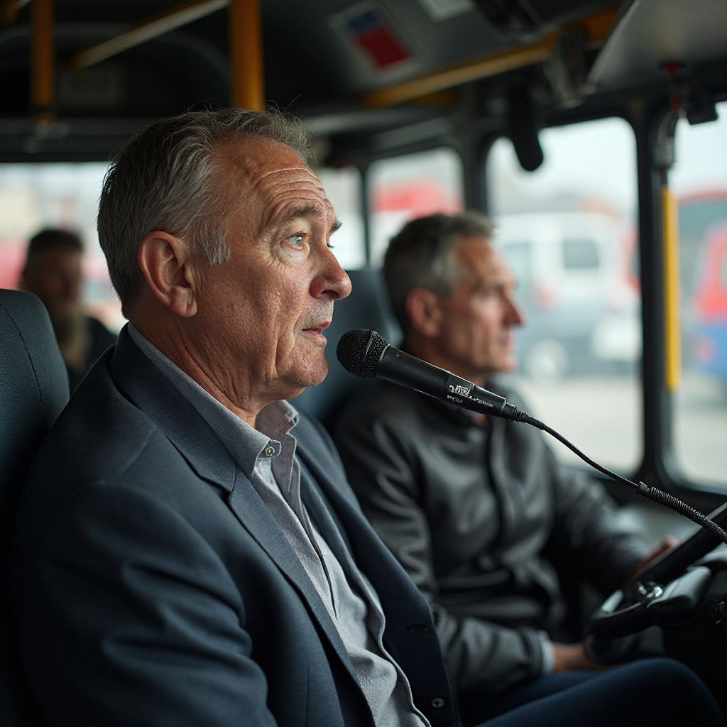 За рулём седого автобуса стоял мужчина около пятидесяти. Его морщинистое лицо с усталыми, но проницательными глазами словно отражало десятилетия пережитого, а синие джинсы и простая тёмная куртка выдавали скромное происхождение. Руки его крепко сжимали руль, а строгая осанка и сдержанные движения показывали привычку держать всё под контролем, несмотря на невыразительную обстановку вокруг. Во взгляде сквозило напряжение, как будто сегодня его внутренний мир хранил тайну, которую никто не должен был узнать.