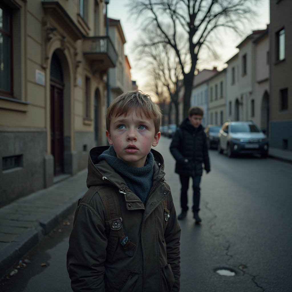 Ростом он был невысокий для своих десяти лет, худощавый, с рыжими растрёпанными волосами, которые повреждённым светом фонарей казались яркими язычками пламени. Его большие зелёные глаза настороженно оглядывались вокруг, отражая смесь растерянности и тревоги. Одет он был в старую куртку, слишком большую и изношенную, с застиранными джинсами и полусырыми сапогами, на которые капали капли с неаккуратно надвинутого капюшона. Руки мальчика были синими от холода, он сжимал небольшую потрёпанную сумку, словно это была последняя ниточка безопасности, удерживающая его здесь. В его позе чувствовалась и уязвимость, и неуклюжая попытка казаться сильнее.