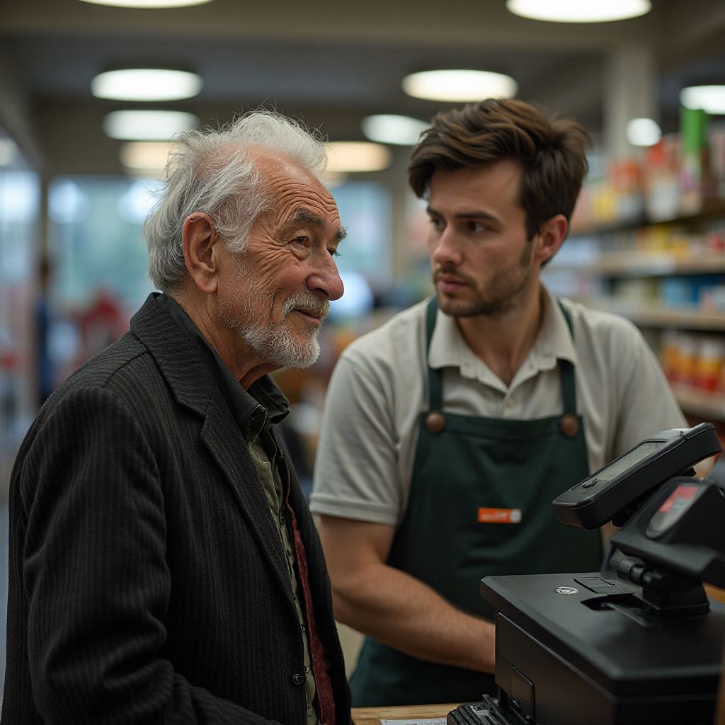 Свет ламп не мог скрыть дрожь, пробегающую по рукам старика, когда он медленно развернул бумажку, спрятанную в старом замятом конверте. В глазах кассира и нескольких задержавшихся покупателей появилось сомнение и растерянность — никто не ожидал, что за простой поход в магазин скрывается нечто большее. Старик, почувствовав внимание, вздохнул глубоко, словно собирая силы для признания.