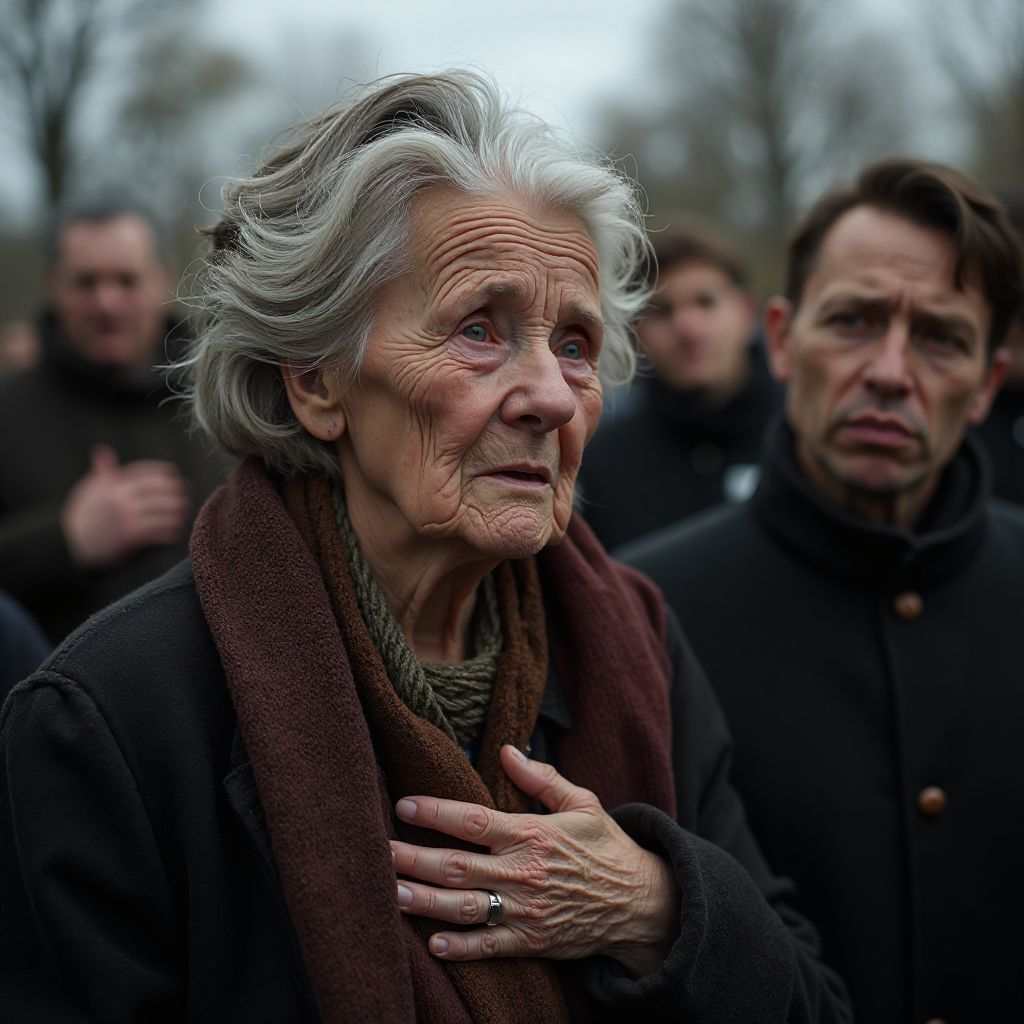 Была там и старушка Мария Ивановна, хрупкая женщина с седыми волосами, туго заплетенными в косу, одетая в поношенный, но аккуратный черный платок и старенькое пальто. Её лицо было изранено временем и горечью прожитых лет, глаза — глубокими морщинами, а руки — лёгкой дрожью от холода и волнения. Она скромно стояла в углу, тихо глядя на гроб, словно боясь нарушить покой. Мария Ивановна была простой пенсионеркой, которую часто игнорировали даже соседи, её жизнь — череда жестоких лишений и одиночества в бедном районе.