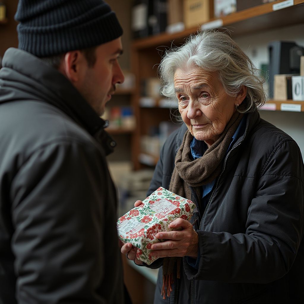 Её лицо, обрамлённое седыми прядями, отражало годы испытаний: глубокие морщины, тихая усталость в голубых глазах и лёгкая улыбка, скрытая смесью горечи и надежды. Руки, дрожащие от возраста, неуклюже сжимали небольшой, аккуратно завёрнутый свёрток — подарок, который она собиралась передать. Её одежда была скромной и слегка потертыми ботинками, словно она была частью этого мира, часто незамеченной и невидимой. Она опустилась на табурет и смотрела на продавца — мужчину за прилавком, который с удивлением застыл, заметив её необычное поведение.