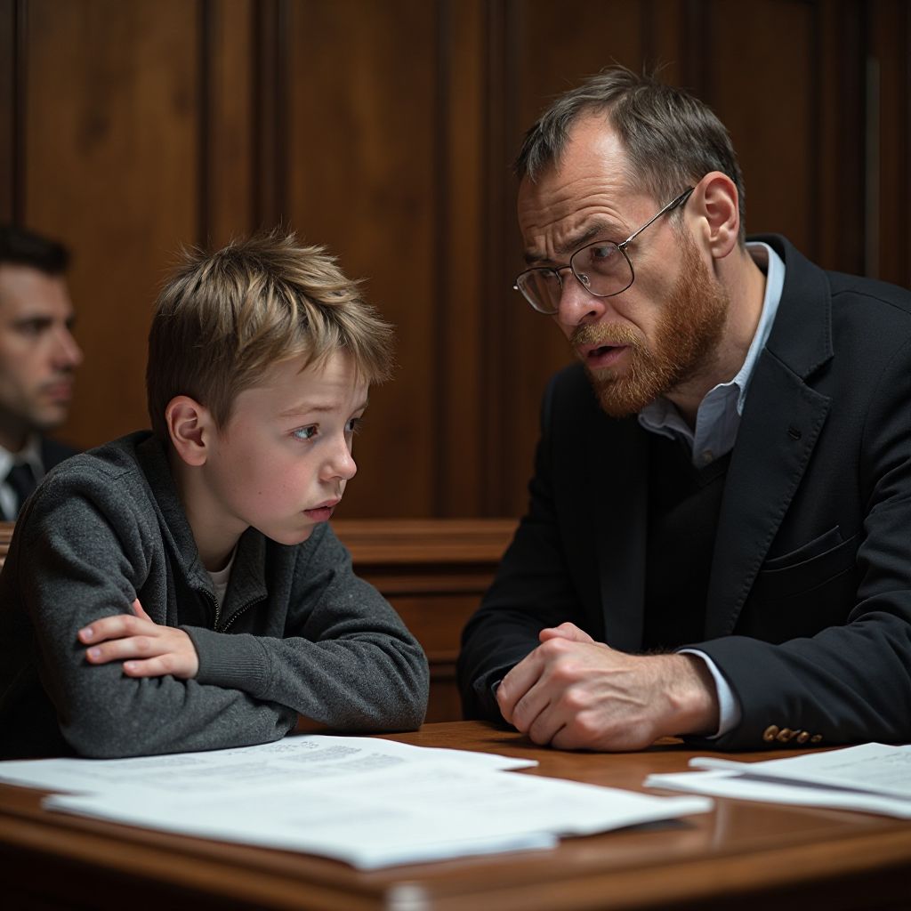За одним из длинных деревянных рядов сидел мальчик лет десяти — худощавый, с тёмными волосами, которые слегка закрывали светло-серые глаза. Его лицо было бледным, а пальцы нервно сжимали края скамейки, словно единственное, что держало его на месте, — это страх и непонимание происходящего. Он был одет в старенький полушерстяной свитер и почти изношенные джинсы, явно не по размеру. Противоположная сторона зала была занята людьми в строгих костюмах и с ухоженной внешностью — их уверенные взгляды и спокойные жесты контрастировали с застенчивой и робкой фигурой мальчика.