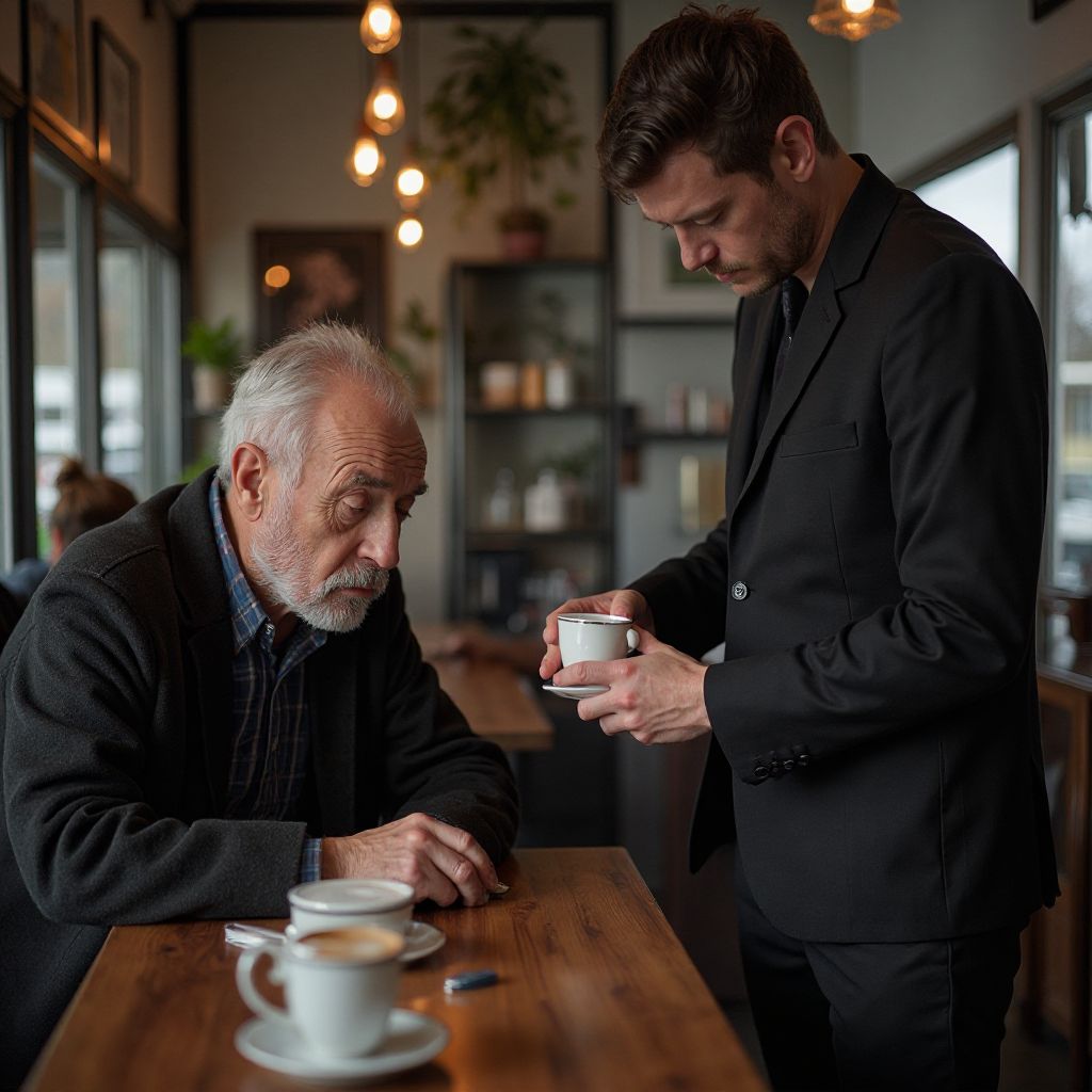 У окна за маленьким столиком сидел пожилой мужчина — седой, с глубокими морщинами, которые каждая прожитая боль оставила у него на лице. Его глаза, затуманенные слезами, не отрывались от чашки пустого стакана. Он был одет в поношенное пальто, слишком большое и вытянутые рукава которого истончивались от времени и многочисленных стирок. Обувь — старая, потертая, прошедшая с ним немало дорог. Его руки дрожали, словно листья на ветру, когда он с тяжелым вздохом встретил взгляд официанта, протягивавшего ему чашку горячего кофе.