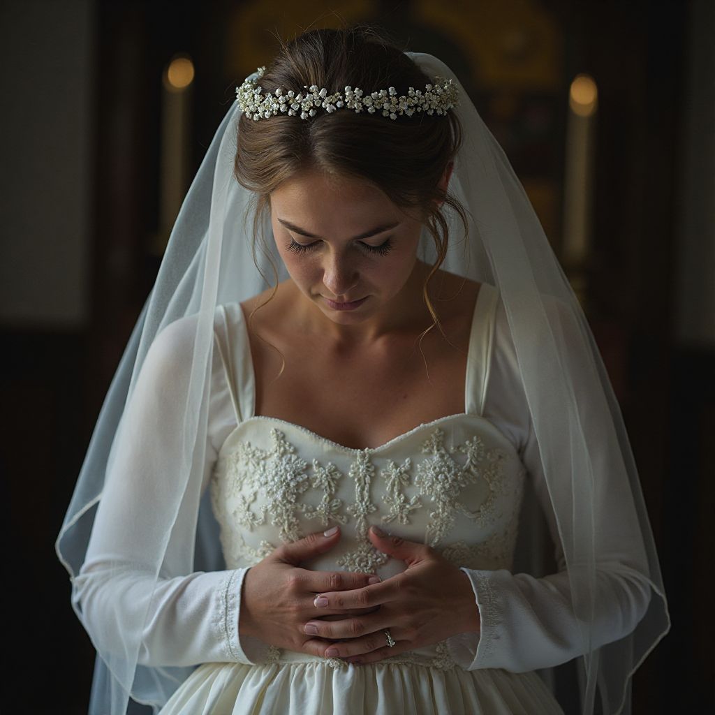Внезапно она почувствовала, как ладони под белым платьем крепко сжимают маленький, холодный предмет, спрятанный в воротничке. Дрожь пробежала по всему телу, вызывая горячее учащённое дыхание и ледяной холод одновременно. Сердце затрепетало словно птица в когтях. «Что если кто-то узнает? Если правда вырвется наружу?» — мысли обрывались на полуслове из-за страха и решимости одновременно. Друзья и родственники смотрели на неё с удивлением и лёгким осуждением; даже священник откашлялся, глядя куда-то в сторону. В воздухе будто повисла невидимая угроза, и все почувствовали, что сейчас случится нечто важное.