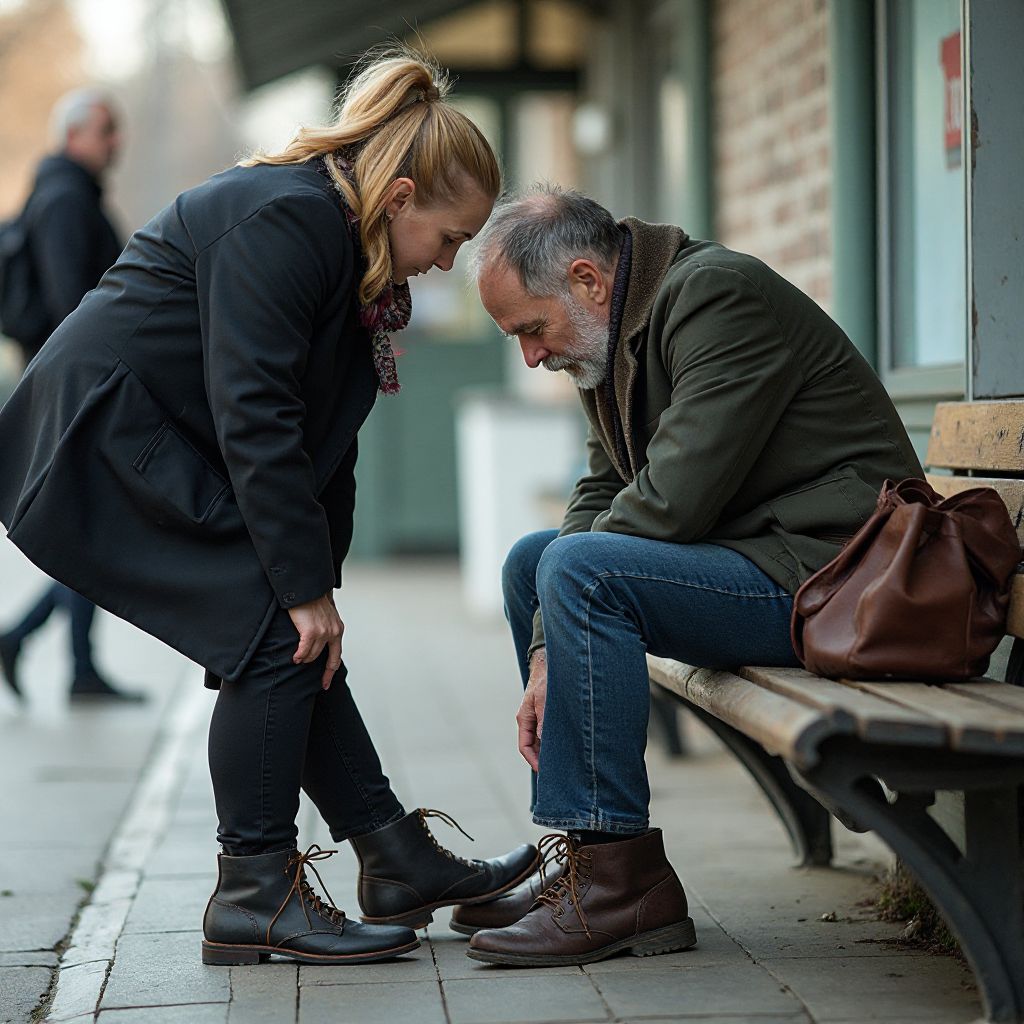 Воздух вокруг словно замер: мужчина аккуратно и почти незаметно очищал пятно с ботинка женщины, а маленький мальчик крепко сжимал её руку, глядя в землю. Его пальцы дрожали, когда он отступил на шаг назад, чтобы скрыть своё действие. Вокруг — серое небо над головой и овалы лиц прохожих, скрывающих свои мысли за масками равнодушия. Женщина слегка нахмурилась и повернулась, её глаза встретились с его, и на секунду в их глубине мелькнуло что-то необъяснимое.