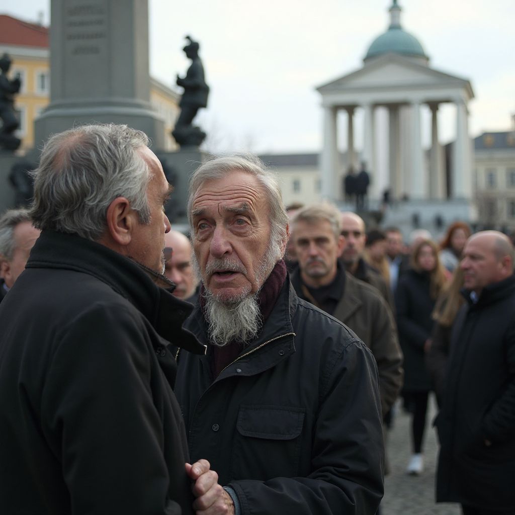 Руки ветерана продолжали дрожать, дыхание учащалось, а на лице выступил холодный пот. Его лицо омрачали тени многолетних страданий и боль утрат. В этот момент что-то в воздухе изменилось, словно невидимая нить связала всех присутствующих, вызвав тревожное предчувствие. Он оглянулся — в глазах прохожих читается смесь уважения и страха. Но что же он собирался раскрыть? Почему его слова так резко сменили атмосферу на площади?