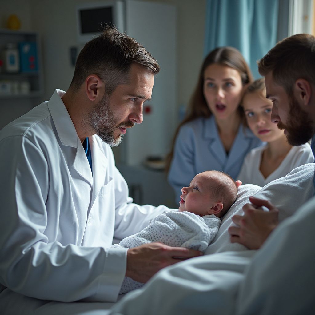 Анна почувствовала, как дрожь пробежала по её спине, дыхание стало прерывистым. «Что мне делать?» — её мысли метались, пока окружающие продолжали неясные разговоры. Врач вдруг резко подошёл к коляске, приподнял покрывало и взглянул на малыша. В это мгновение всё в комнате замерло.