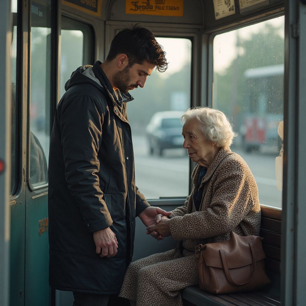 Мысли парня бились волнением — он спешил на встречу, но что-то заставило его задержаться. Он заметил старушку, которая стояла у края остановки, прижавшись к стене, без сумки и с пустым взглядом. Сердце его ужалось — в этом взгляде была боль, которую сложно описать словами. Он решил подойти и предложить помочь, но голова была полна тревог и сомнений. Что если её что-то обидело? Почему она молчит и отказывается от помощи?