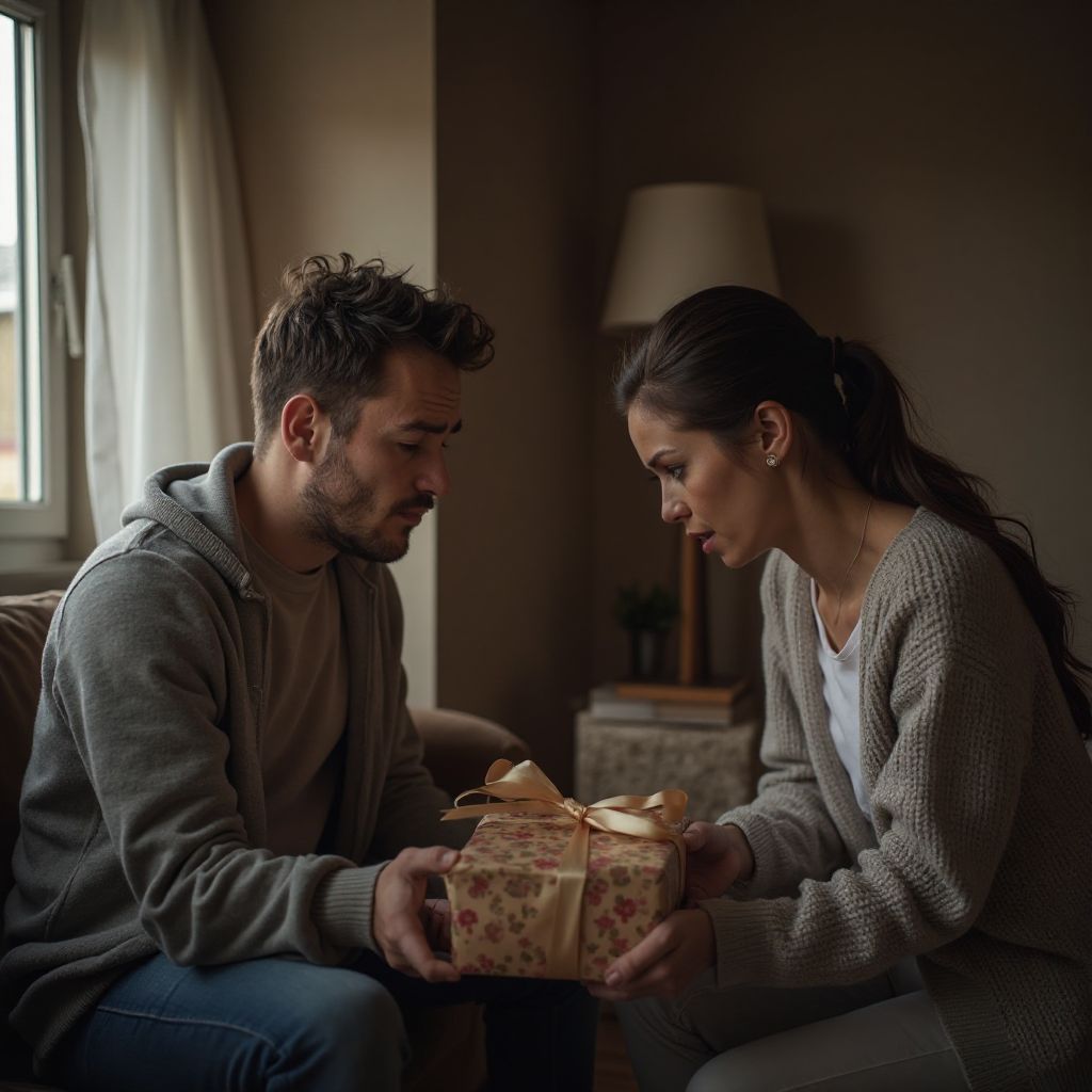 «Иногда подарок — не то, что лежит в коробке, а возможность увидеть правду, которая освобождает и лечит,» — подумал Пётр, глядя на жену.