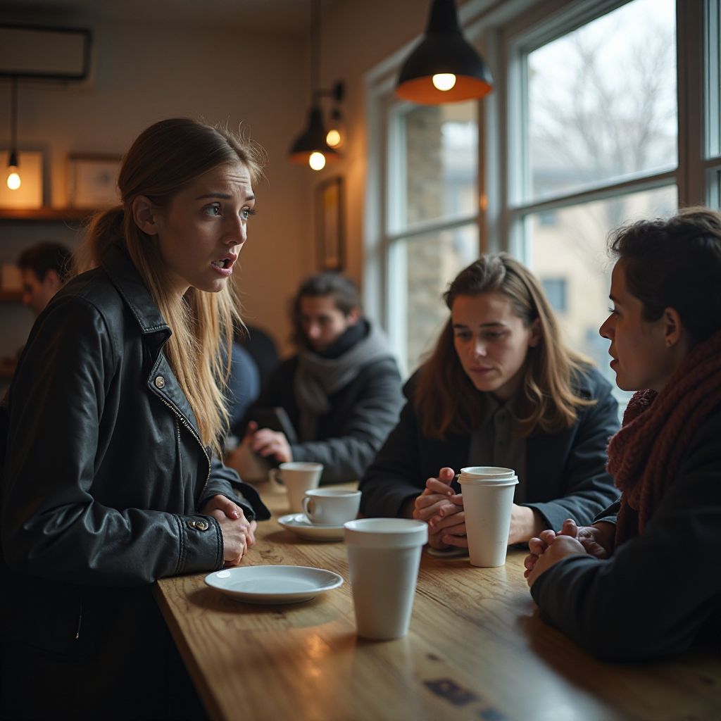 В дверь вошла молодая женщина. Её худощавая фигура, обтянутая ветхим пальто и потертой шапкой, словно скрывалась в тени сияющего интерьера. Глубокие изумрудные глаза блестели усталостью и тревогой, а руки дрожали от холодного ветра и волнения. На лице — следы недавних слёз, хотя губы сжаты в напряжённой готовности к борьбе. Она тихо подошла к стойке и заказала чашку кофе, её голос едва слышался, словно боялся нарушить тишину.