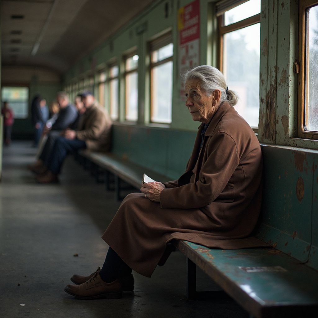 Старушка почувствовала, как холодный воздух пронизывает сквозь пальто, но оставалась неподвижной. Мысли её были тяжёлы, как камень на дне души. Она ждала кого-то или чего-то — может быть, прощения, а может — правды. Сердце сжималось от воспоминаний о жизни, полной лишений и несправедливости, которыми ей пришлось пройти. Вокзал казался ей последним укрытием от мира, где любую историю можно услышать и рассказать, не боясь быть осужденным.