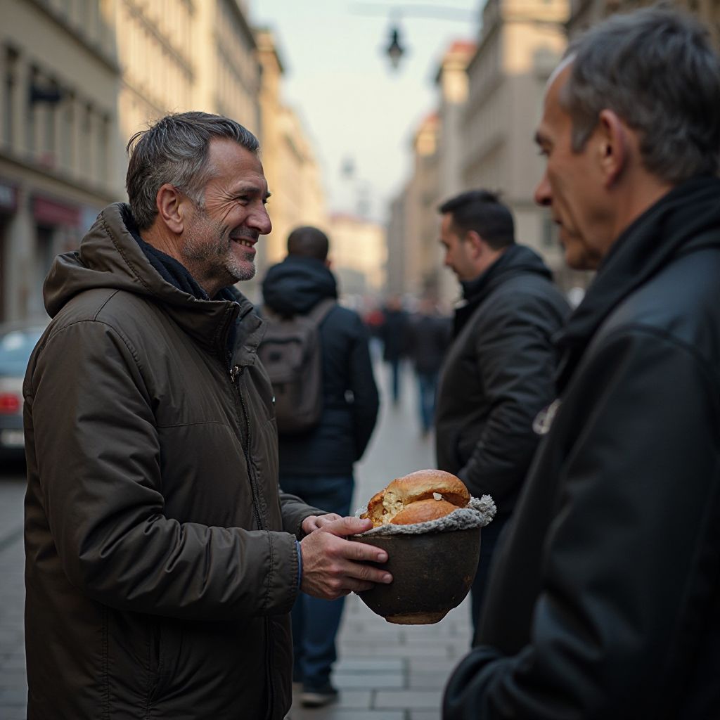 На пересечении двух старых улиц, у входа в небольшое уличное кафе, стоял мужчина среднего возраста. Его рост чуть выше среднего, фигура худощавая, но не ослабленная болезнью — скорее выношенная временем и переживаниями. Глубокие глаза цвета тёмной смолы и спокойное лицо с лёгкой щетиной контрастировали с его поношенной курткой и потёртыми джинсами. Он держал в руках пакет с несколькими горячими бутербродами и термос с чаем, готовясь поделиться ими с теми, кто сидел неподалёку на мягких синтетических одеялах. Его осанка сдержанна, движется он осторожно, будто боясь нарушить невидимый порядок вокруг. И хотя его одежда не отличалась богатством, в его взгляде читалась забота, и в манере говорить — уважение к каждому человеку.