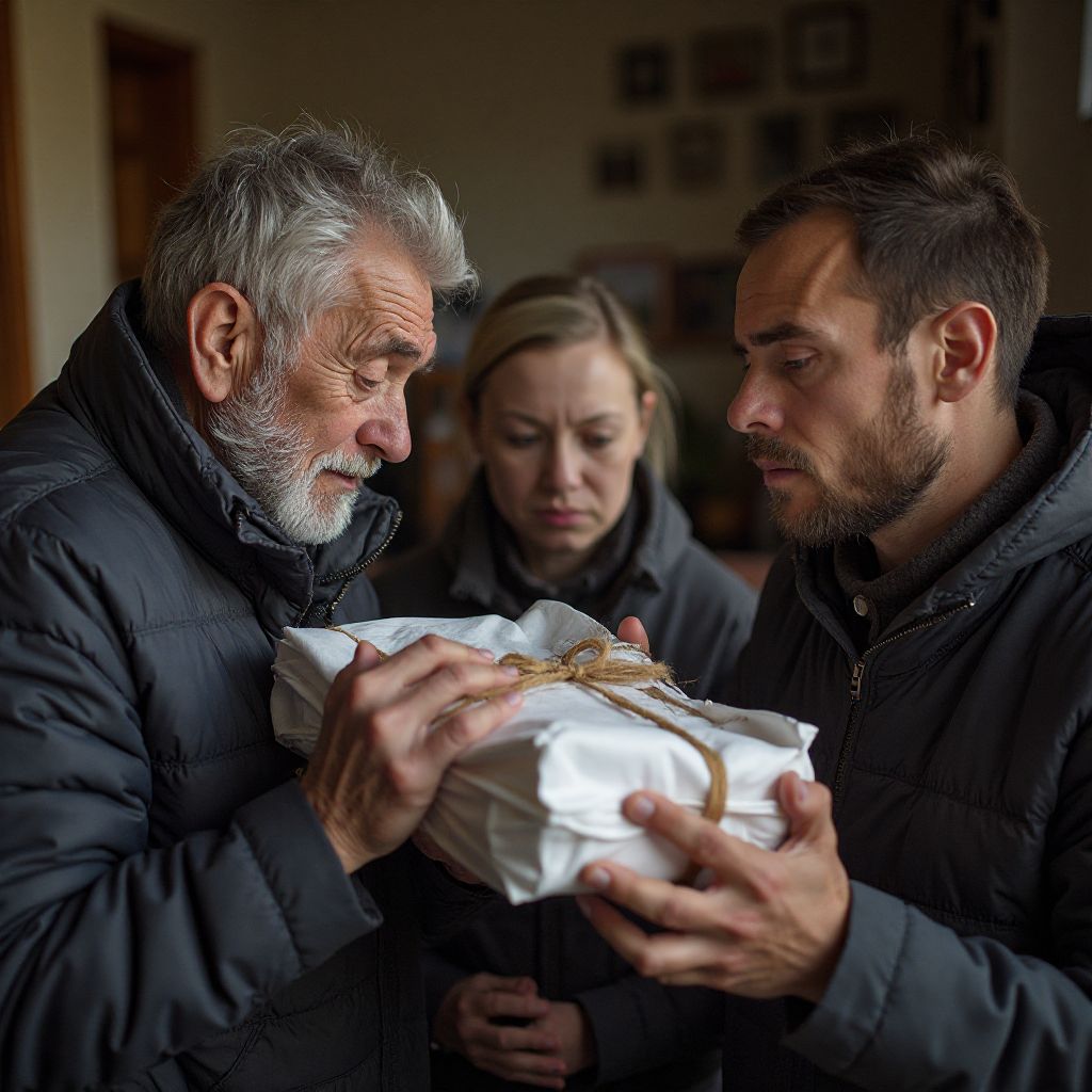 «Осторожней с этим! Лучше бы оставил в покое», — прошептала женщина, стоявшая неподалёку, глаза её блестели от слёз. Я увидел, как старик сжал свёрток, дрожащие пальцы выставляли эту вещь напоказ словно груз совести прошлого. Сердце вдруг застучало оглушительно, мурашки пробежали по спине, дыхание стало чаще — внутри меня рождалось ощущение, что сейчас произойдёт что-то важное, страшное и правдивое.