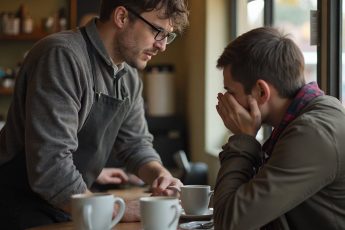 Вечерние огни кафе мягко отражались в стеклах, наполняя помещение тёплым желтоватым светом.