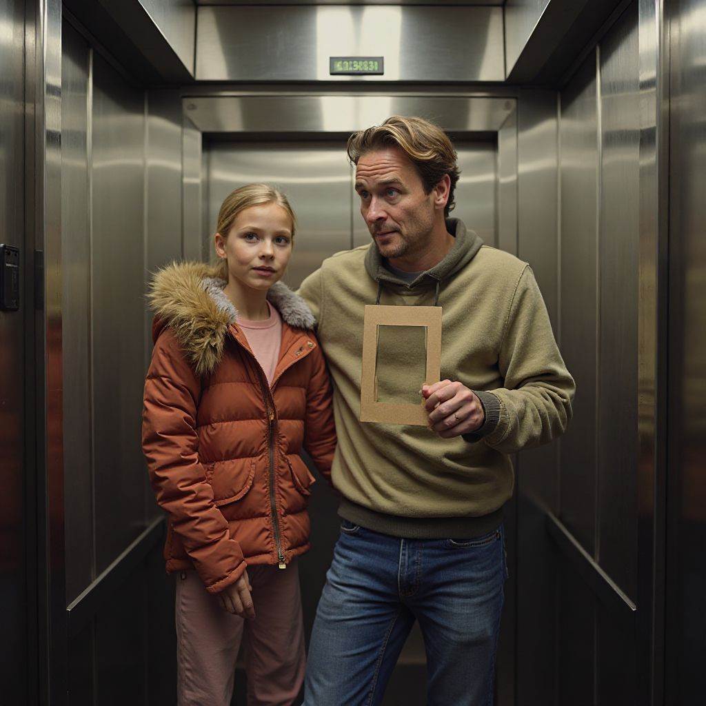В лифт вошёл незнакомец — мужчина с угрюмым лицом, серыми глазами и ветхим, поношенным пальто. Он держал в руках старую фоторамку, за которой угадывалась облезлая бумага с пожелтевшими фотографиями. Погода за окном холодала, лёгкий дождь начал постукивать по стеклам. Девочка заметила, как мужчина слегка вздрагивает от каждого удара дождя, а его руки крепче сжимают рамку.