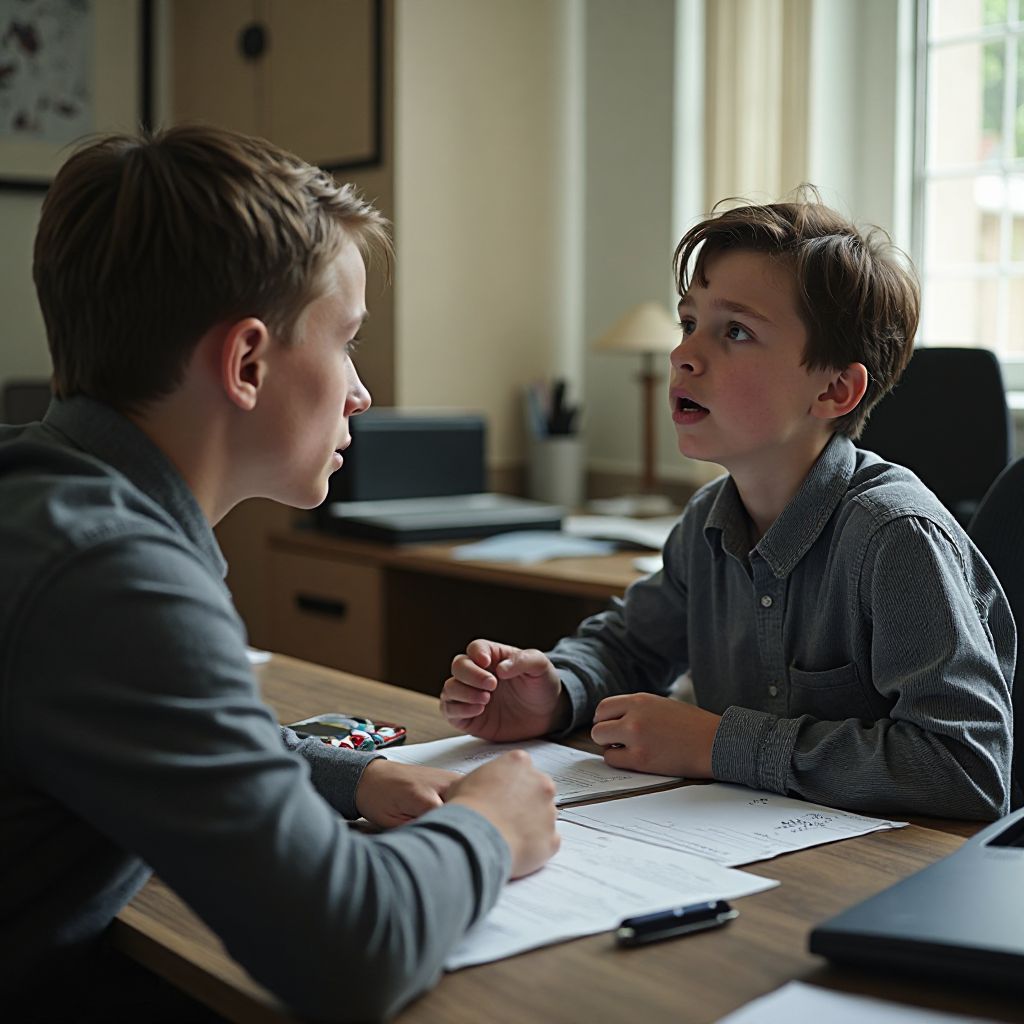 Раздался скрип открывающейся двери, и директор, седой мужчина с проницательными глазами, приветливо, но серьёзно кивнул. «Иван, садись, нам нужно поговорить», — произнёс он низким, но ровным голосом. Вокруг казалось, что время остановилось, когда Иван сел на холодный деревянный стул.