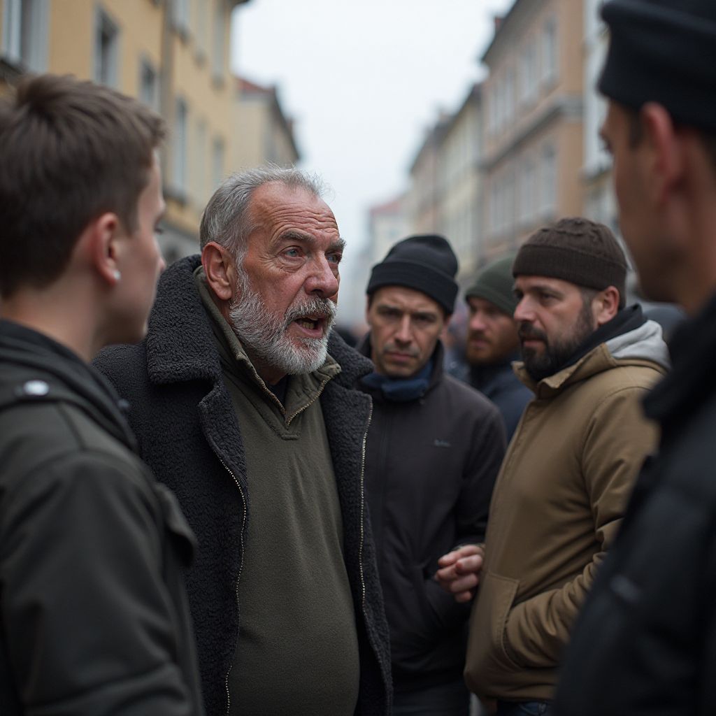 Внезапно он зашептал: „Война… она забрала всё: дом, семью, надежду…“ Двое молодых прохожих обменялись взглядами. „Ты о чём?“ — спросил один из них с недоверием. „Этот пьяный опять изгаляется“, — фыркнула женщина из толпы, отстраняясь. Но мужчина продолжал, голос его становился всё уверенней: „Знаете, каково терять всё? Снег, снаряды, пепел… Ты видишь, как жизнь превращается в прах. Я — ветеран, но остался без крышки и хлеба. А эти богачи? От них лишь холод и пренебрежение.“