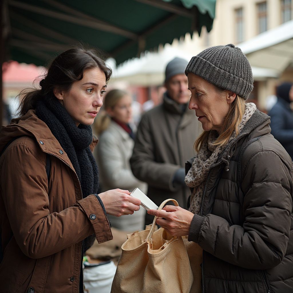«Ты должна понять — это не просто бумага», — внезапно прозвучал дрожащий голос внутри головы. Постепенно в толпе возникали шёпоты и предположения: «Возможно, там помощь… Или опасность?» Незнакомка исчезла так же внезапно, как и появилась, оставив после себя тревожный след и множество вопросов. Женщина стояла между прилавками, осознавая, что теперь её жизнь irrevocably изменилась.