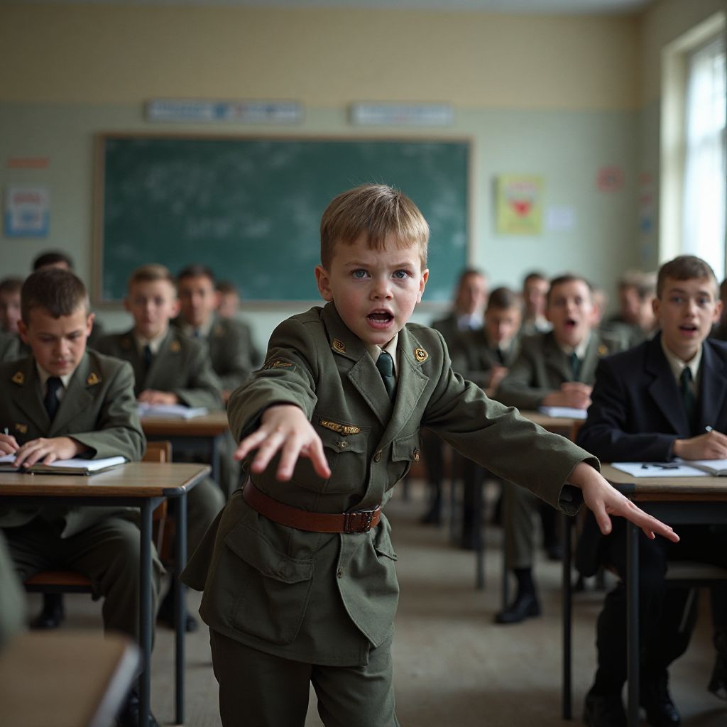 Мальчик в военной форме, ещё со слезами на глазах, резко вышел из класса, оставляя за собой гнетущую тишину и множество вопросов. В его груди билось сердце, наполненное одновременно страхом и надеждой. Учитель, ученики и даже посторонние присутствующие в коридоре замерли в ожидании продолжения, не веря, что это всего лишь детский каприз.