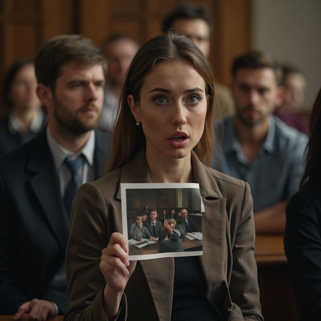 Когда она молчала, напряжение в зале стало ощутимым, словно воздух сделал плотным и густым, а все взгляды — от суровых судей до затаившихся слушателей — устремились на неё. В одно мгновение из её сумки была извлечена старая, пошарпанная фотография. Она резко подняла её перед всеми, и тишина, словно свинцовое одеяло, повисла над залом.