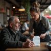 Перед ней стояла молодая женщина невысокого роста, с распущенными тёмными волосами, которые едва прикрывали худощавое лицо с большими выразительными глазами цвета мокрого асфальта. В одежде — простая старая куртка и выцветшие джинсы, на ногах — потрёпанные ботинки. Её плечи дрожали не только от холода, но и от внутренней тревоги, словно весь мир развернулся против неё. Она казалась полной противоположностью мерцающей витринам магазина роскошных товаров по соседству — обычная, уставшая и, возможно, потерянная.