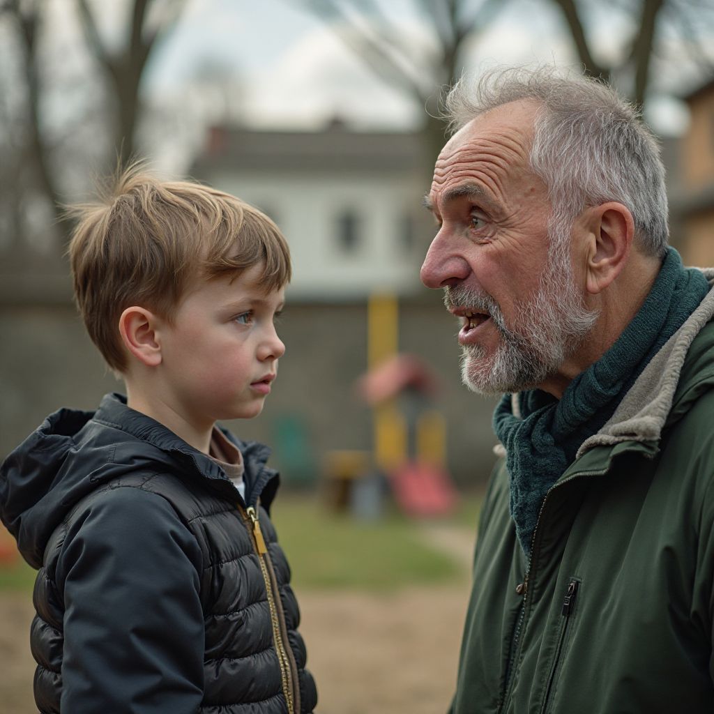 Вдруг неподалёку, у песочницы, появился высокий мужчина в потёртом пальто и с усталым лицом. Его седые волосы торчали в разные стороны, а глаза, казалось, пронзали пространство насквозь. Один из воспитателей, заметив его, сказал строго: «Извините, место для родителей и детей. Проходите, пожалуйста, дальше». Мужчина с трудом улыбнулся, слегка поклонился и начал отступать, но взгляд его был настойчив. Лену удивила эта сцена — кто он такой, и почему смотрит так пронзительно? В этот момент мальчик в ярком красном жилете, играющий неподалёку, подошёл к незнакомцу и тихо сказал одно слово: «Папа».