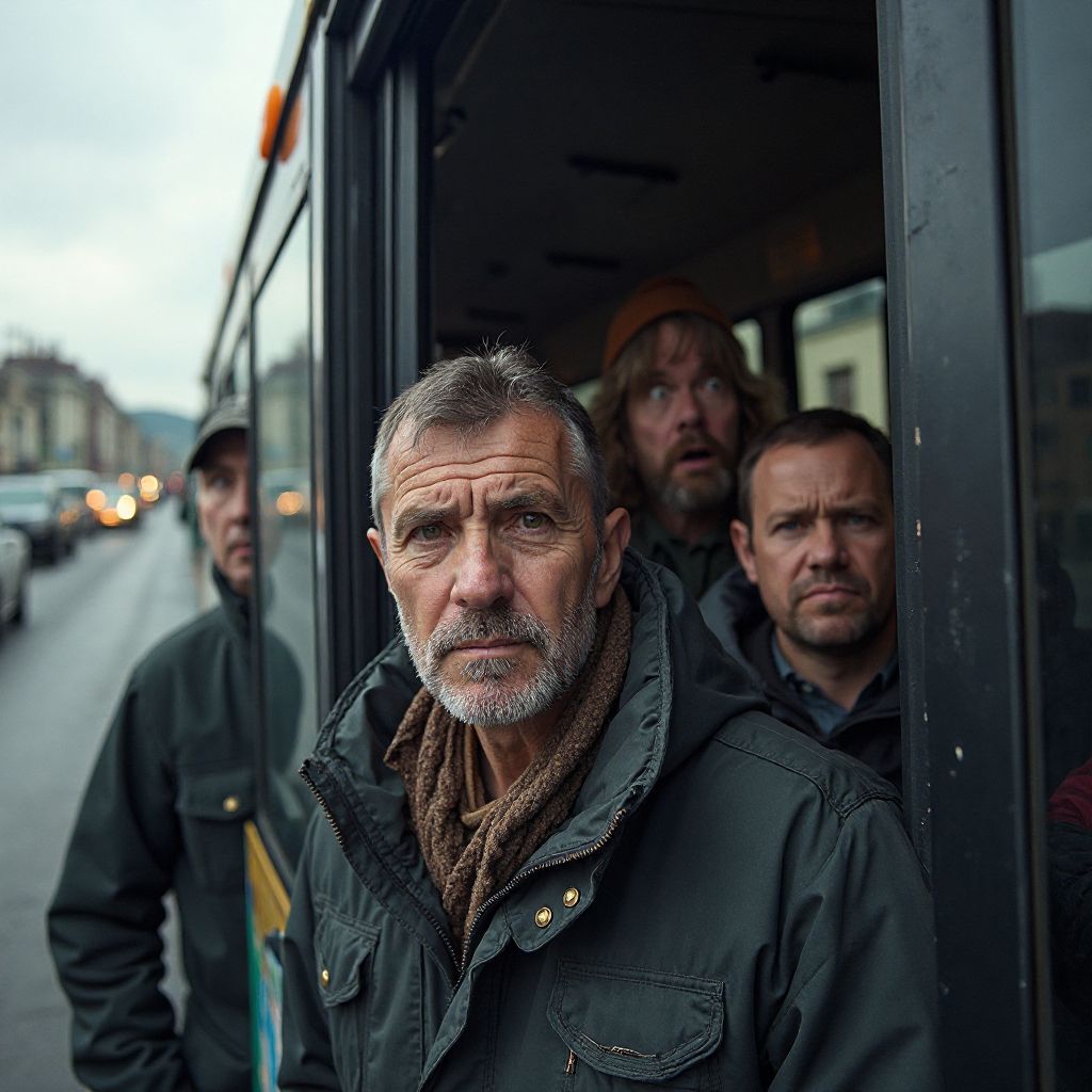 Водитель автобуса, мужчина средних лет с вытертым лицом и усталыми глазами, сидел за рулём в потрёпанной куртке, спеша закончить ещё один рабочий день. Его руки крепко сжимали руль, а взгляд, казалось, сканировал каждый уголок улицы, ожидая неожиданностей. Он был человек простой, из тех, кого не замечаешь на улицах города — в рваных ботинках и старой двубортной куртке. Но в его глазах затаилась усталость, перемешанная с горечью от несправедливостей, которые он видел вокруг.