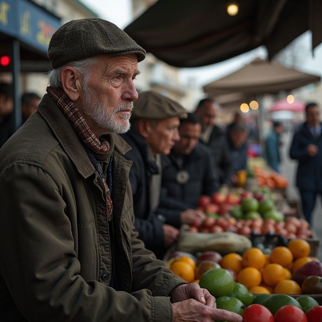 Посреди общего хаоса выделялся старик с иссохшим лицом и глазами цвета дождливого неба. Его фигура была небольшой, почти сутулая, в выцветшем пальто, которое явно пересматривало лучшие времена. Небрежно завязанный платок скрывал редеющие седые волосы. Его руки дрожали, когда он сжимал пластиковую корзину с несколькими овощами, а на руках заметны были следы работы на огороде и долгих лет трудов. Скромная обувь, подбитая каплей клея, еще с годами неслась по камням, скованная усталостью и днями. Он стоял в стороне, словно пытаясь слиться с серо-бурой стеной рыночных прилавков, хотя его душа кипела напряжением.